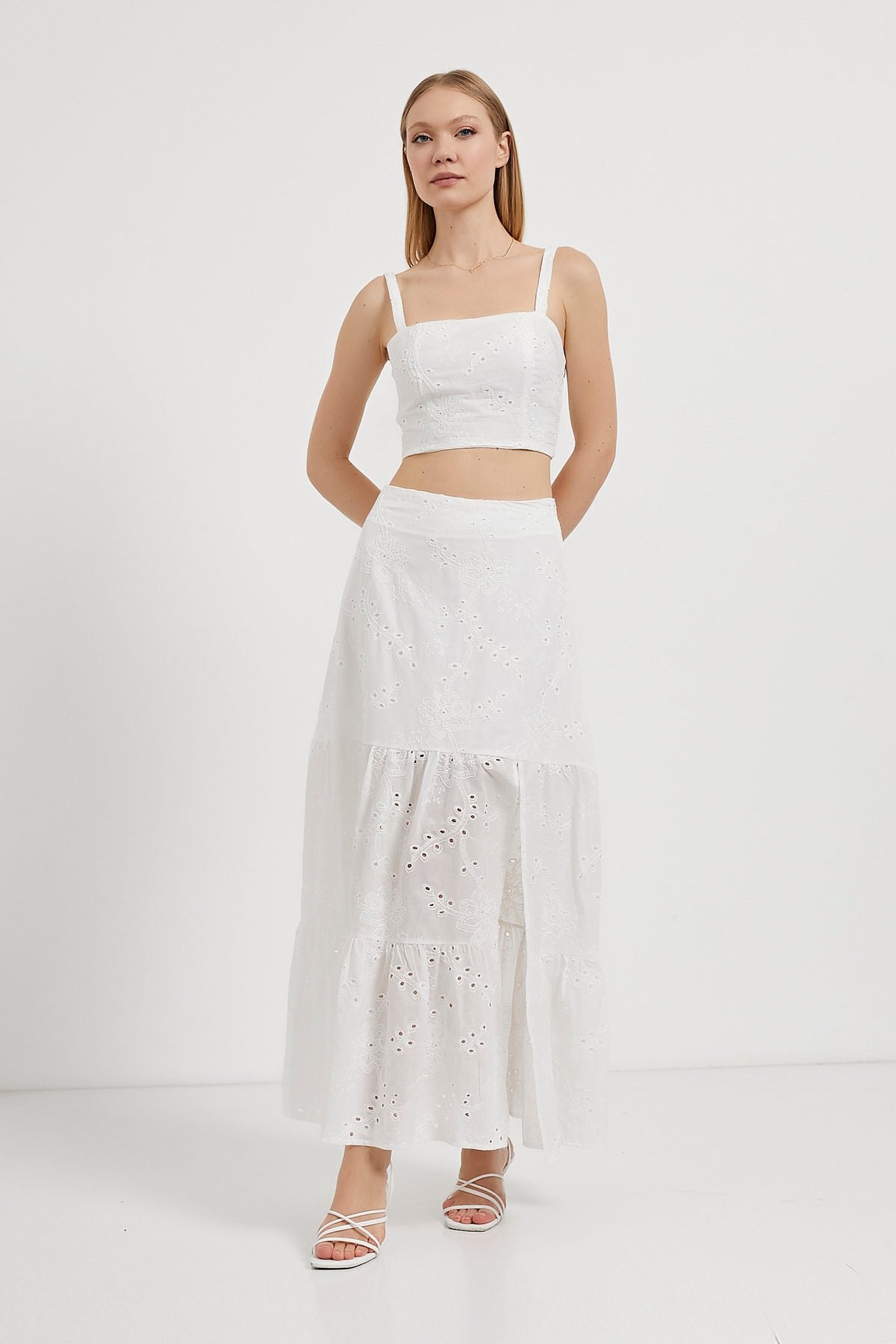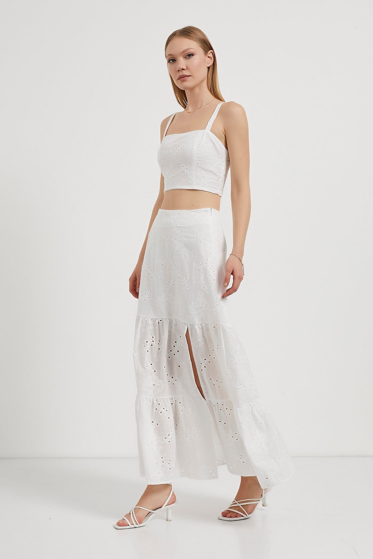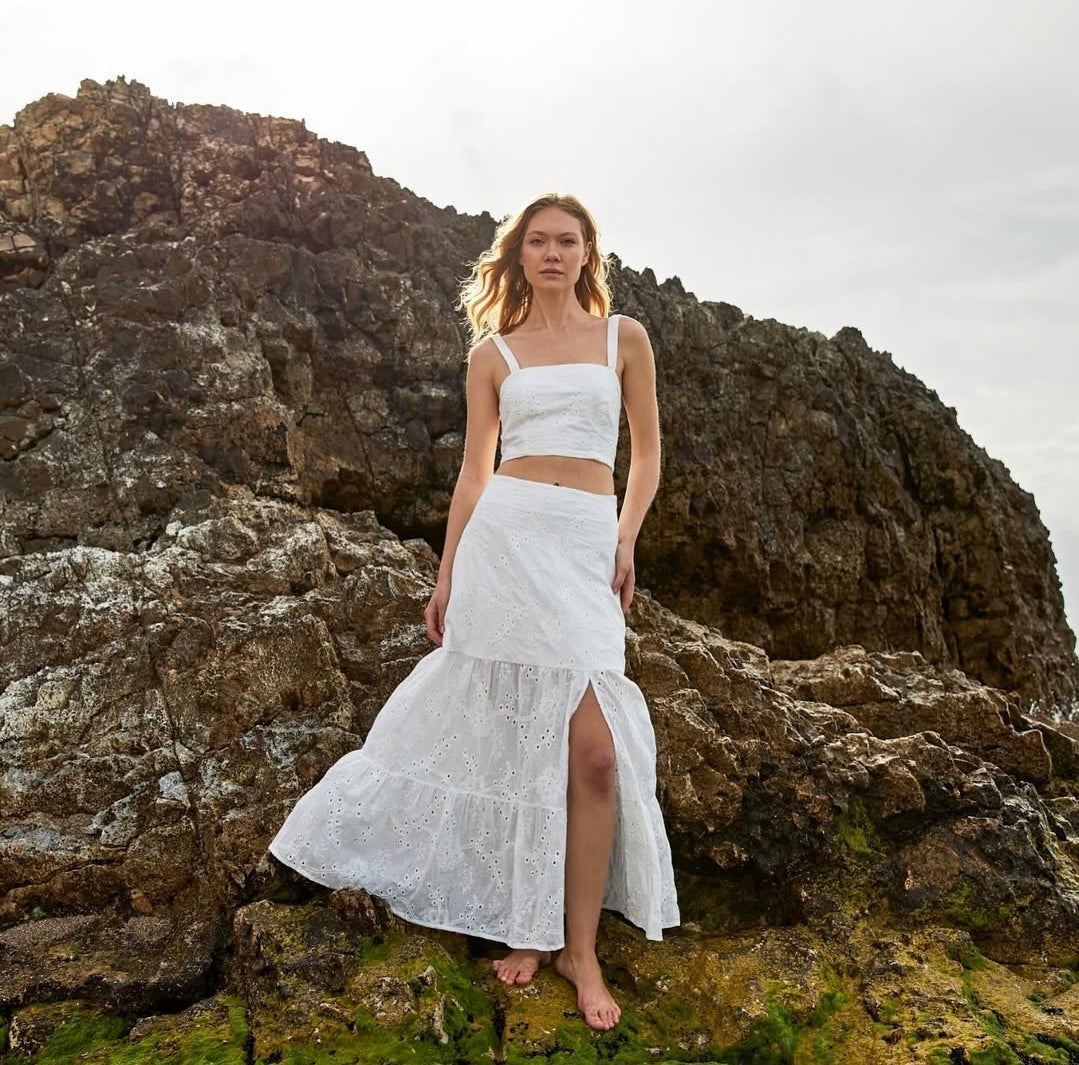 Breeze through summer in the Isla Broderie Cotton Set. This dreamy white two-piece features a square-neck cropped top and a tiered maxi skirt with a front slit, crafted from soft broderie anglaise cotton. Lightweight, breathable, and effortlessly feminineโthis set is perfect for beach escapes, garden strolls, or sunset dinners by the sea.