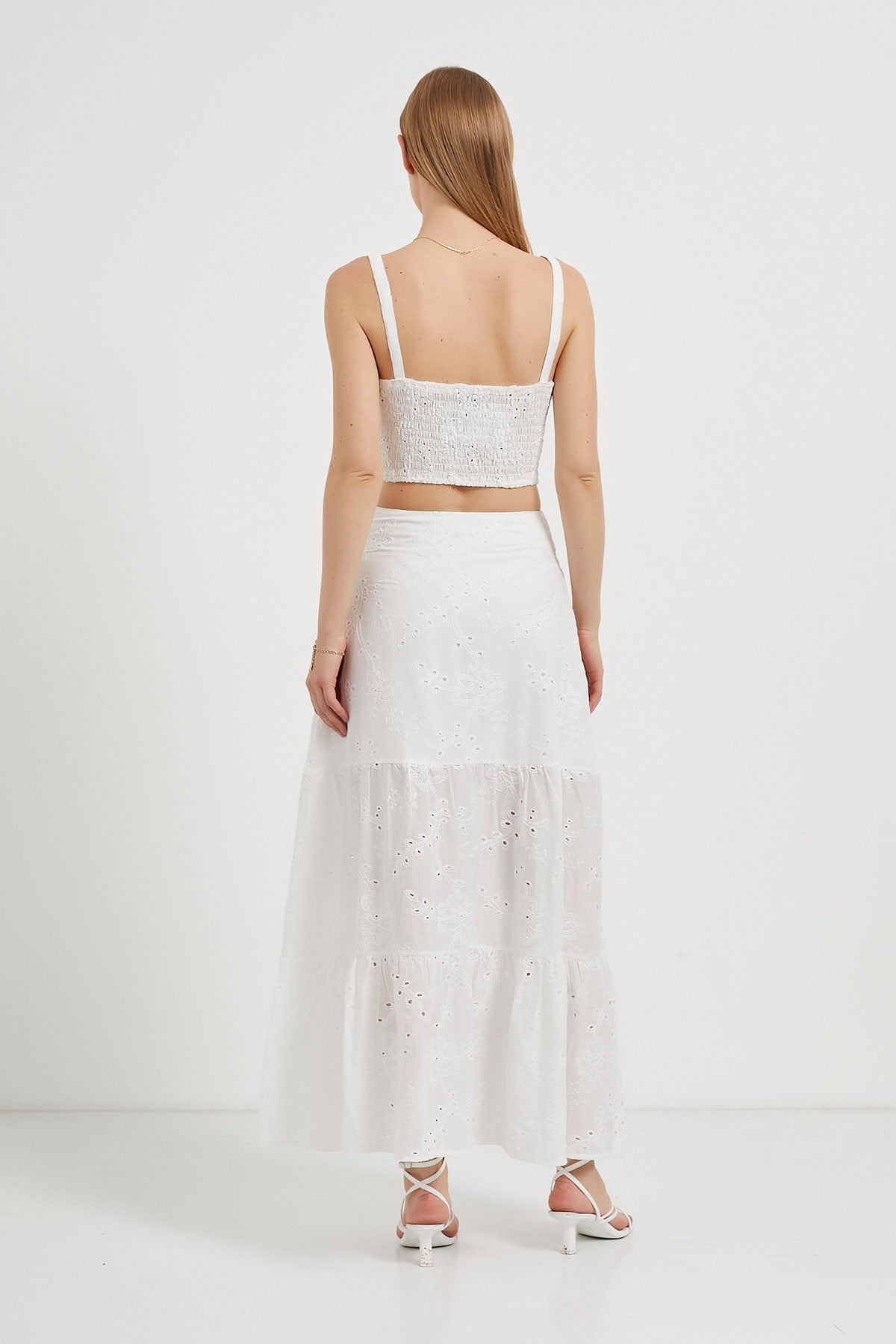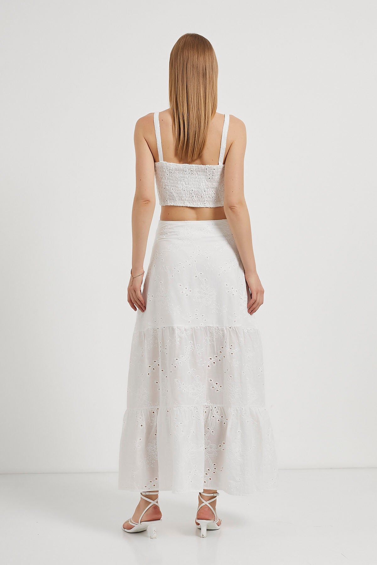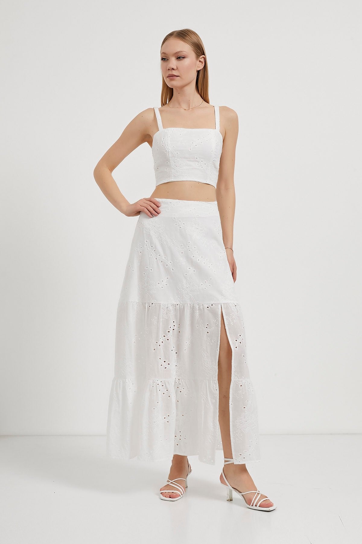 Breeze through summer in the Isla Broderie Cotton Set. This dreamy white two-piece features a square-neck cropped top and a tiered maxi skirt with a front slit, crafted from soft broderie anglaise cotton. Lightweight, breathable, and effortlessly feminineโthis set is perfect for beach escapes, garden strolls, or sunset dinners by the sea.