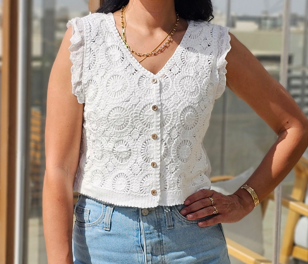 Add a touch of effortless charm to your summer wardrobe with our Boho Crochet Button Front Vest.
