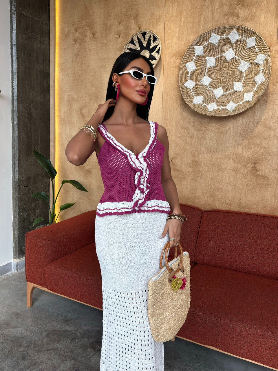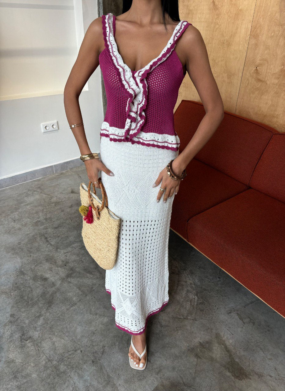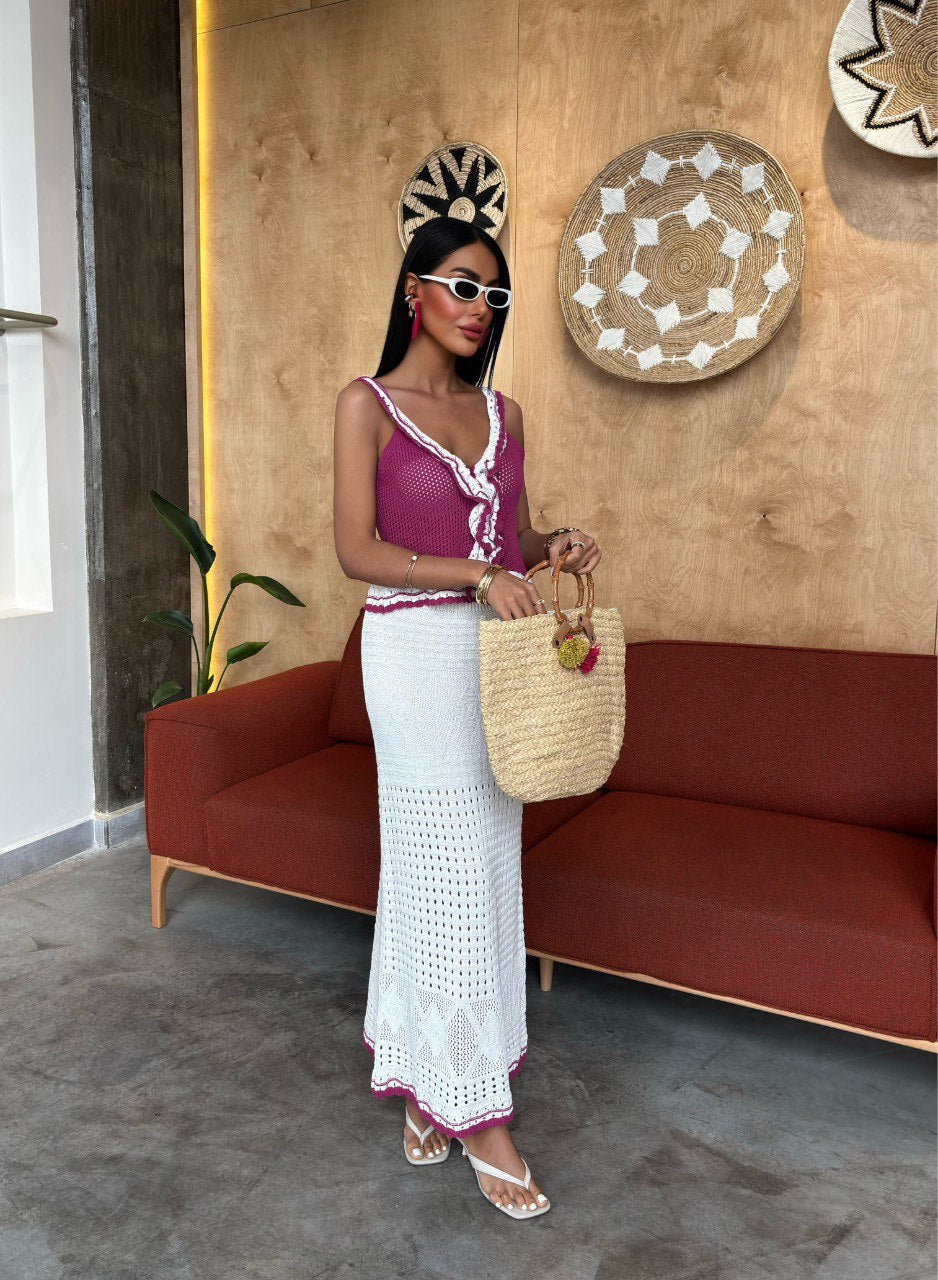 Turn heads in this stunning handmade crochet set, featuring a fuchsia ruffle-trimmed top with a flattering v-neckline and a matching long white skirt. The lightweight, breathable fabric and open-knit design make it the perfect beach-to-brunch outfit. Finished with playful ruffle detailing and a touch of contrast color at the hem, this set is effortlessly chic and comfortable. Pair with sandals and a straw bag for the ultimate summer look.