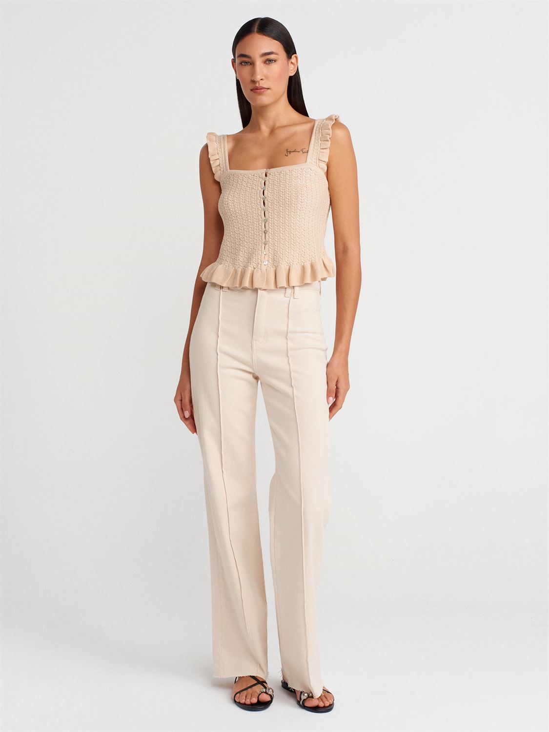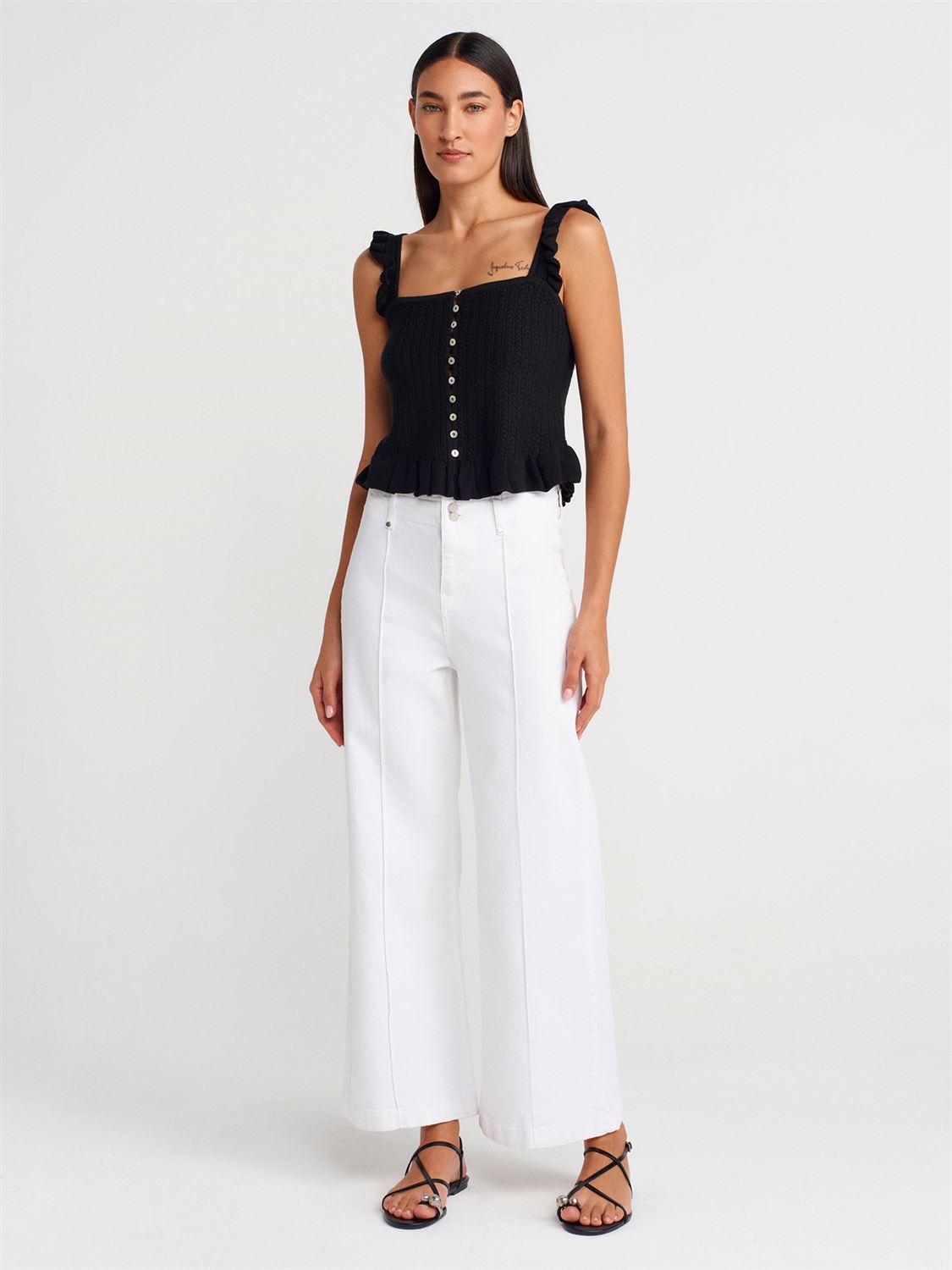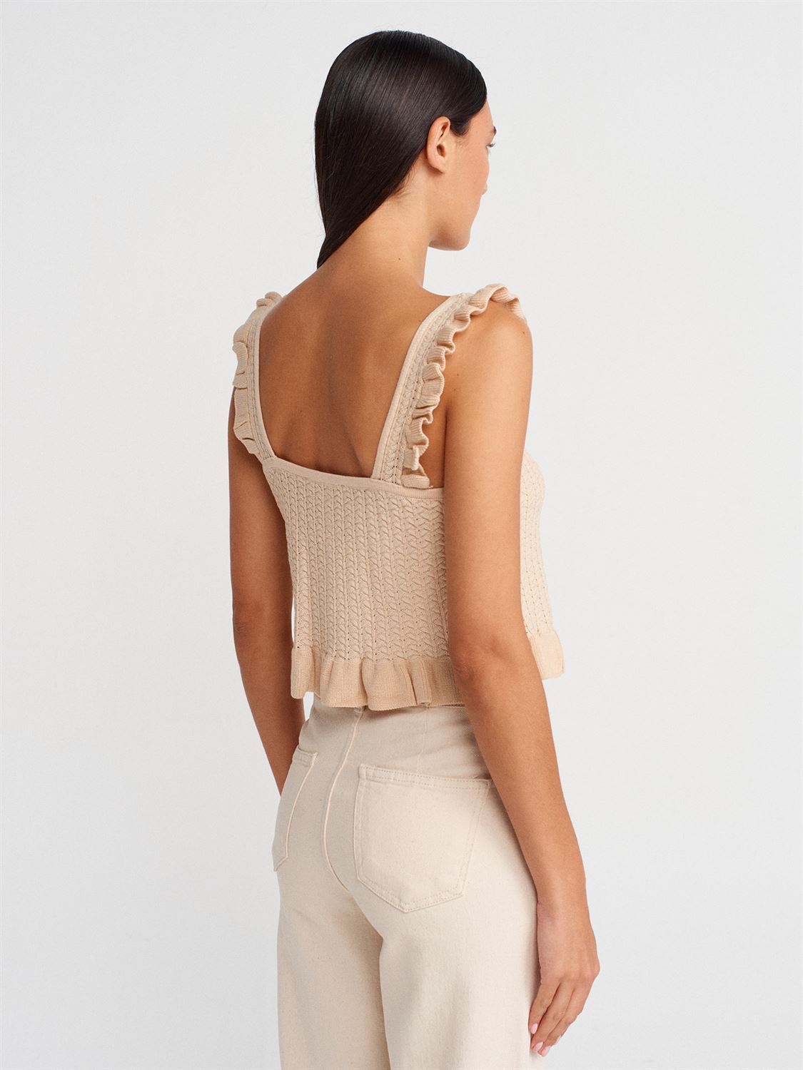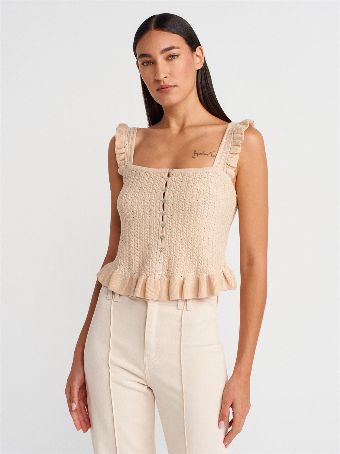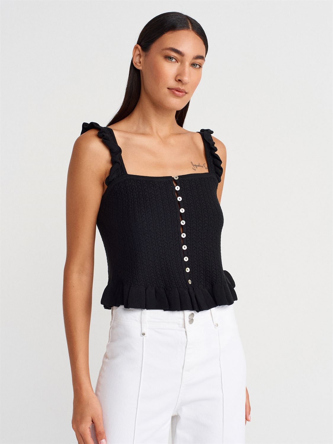 Sweet meets chic in this ruffle strap knit crop top. With its textured knit fabric, delicate front buttons, and feminine ruffle details on the shoulders and hem, this piece adds the perfect soft touch to your wardrobe. Pair it with high-waisted jeans or flowy skirts for a trendy day-to-night look.