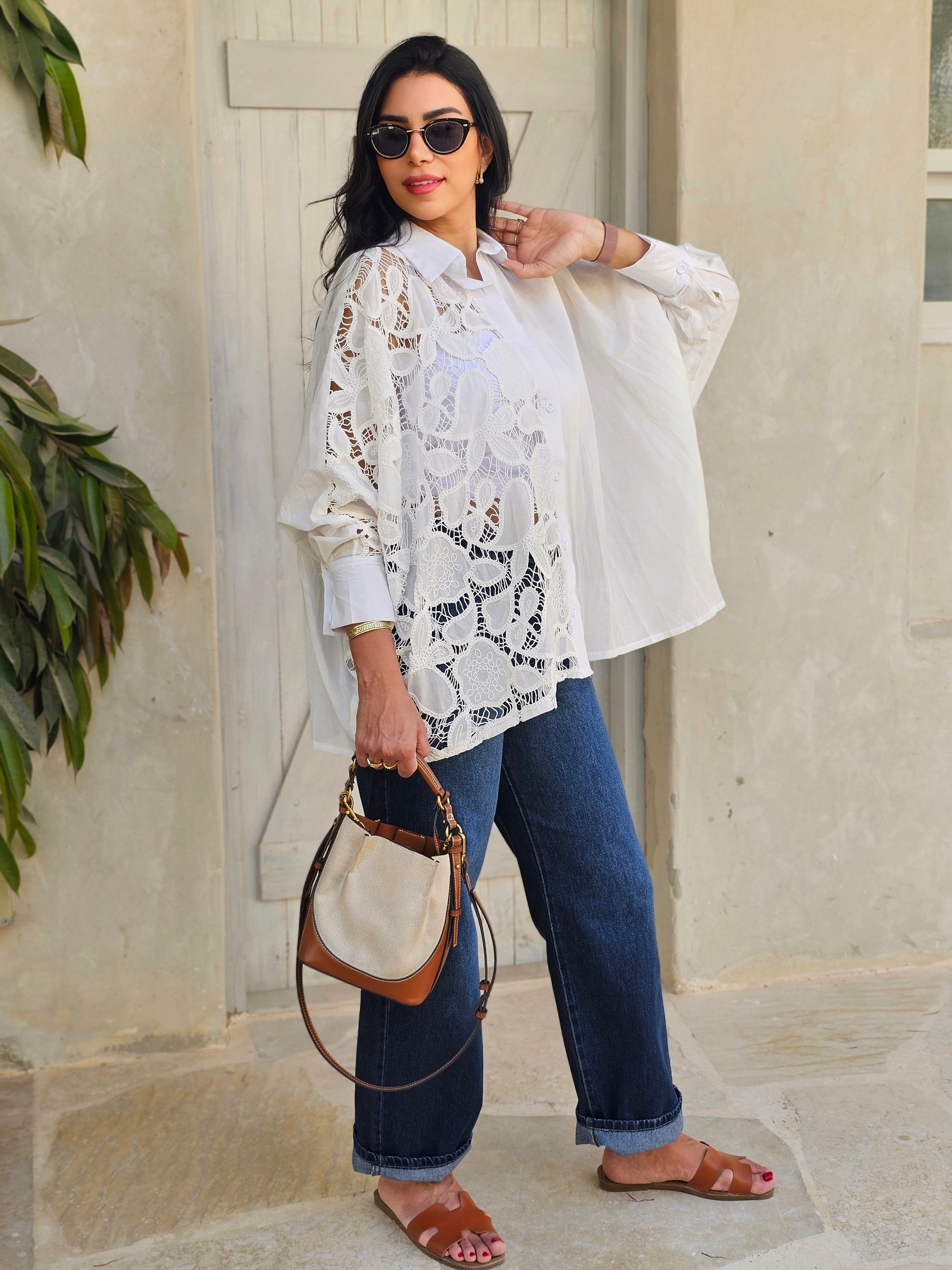 Elevate your look with our Sheer Lace Patchwork Shirt, a modern blend of classic tailoring and romantic detailing. This button-down shirt features intricate lace panels on one side, contrasted with sheer fabric for an effortlessly chic statement. Its voluminous sleeves and oversized fit make it the perfect layering piece for both casual and dressed-up outfits. Ideal for brunches, summer nights, or that cool, effortless vibe you love.